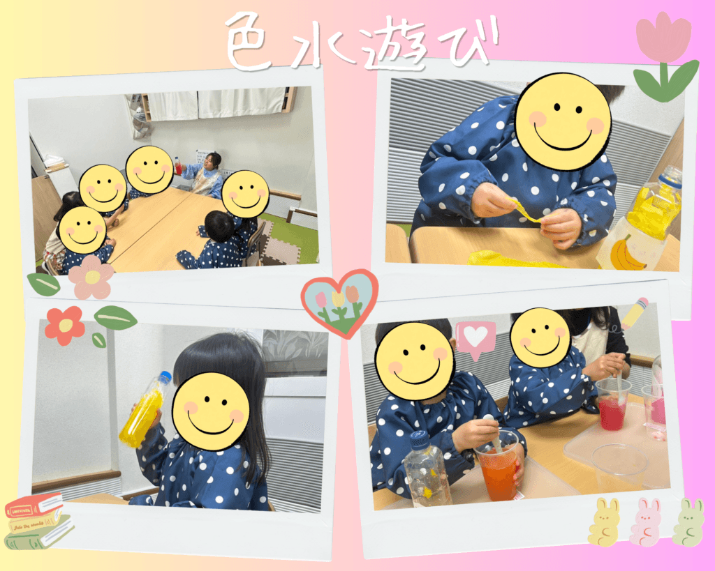 そんなドキドキした気持ちを和らげてほしいなと思い、年少さんから年長さんのお友達と4月のはじめに子どもたちが大好きな色水遊びを行いました😊